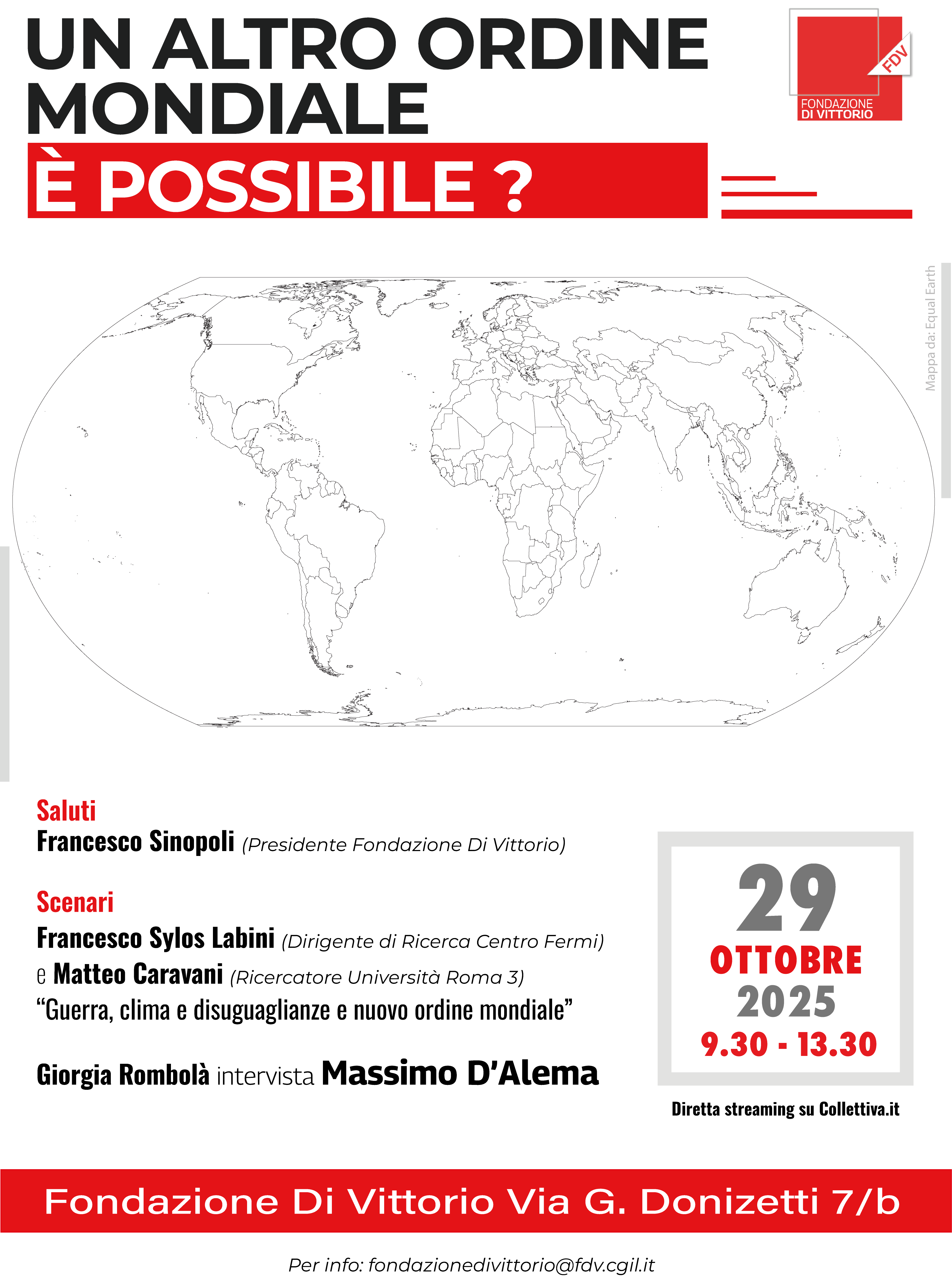 Per favorire una riflessione collettiva il 29 Ottobre nell’ambito del ciclo seminariale permanente della Fondazione Di Vittorio avremo ospite Massimo D’Alema intervistato da Giorgia Rombolà.