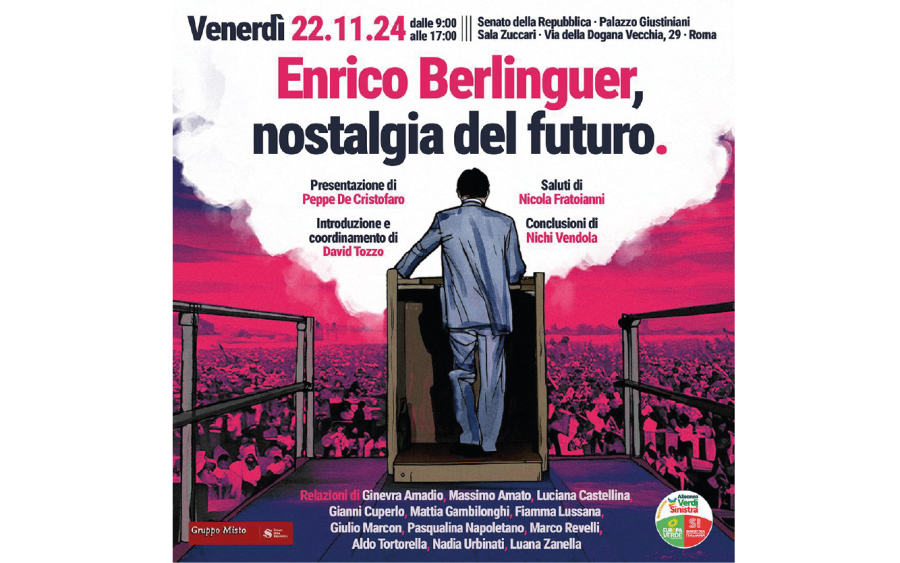 Nel quarantennale della scomparsa di Berlinguer, sulla scorta di un ragionamento di David Tozzo e di Mattia Gambilonghi (Fondazione Di Vittorio), da un’idea e su iniziativa del capogruppo al Senato Peppe De Cristofaro, Alleanza Verdi e Sinistra ha organizzato per il 22 novembre prossimo l'iniziativa dal titolo "Enrico Berlinguer, nostalgia del futuro".
