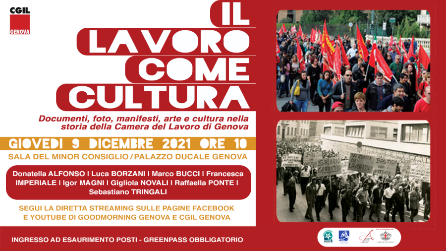 Giovedì 9 dicembre 2021 alle ore 10 presso il Salone del Minor Consiglio a Palazzo Ducale si terrà l’evento pubblico organizzato dalla Cgil di Genova dal titolo “Il lavoro come cultura. Documenti, foto, manifesti, arte e cultura nella storia della Camera del Lavoro Metropolitana di Genova”.