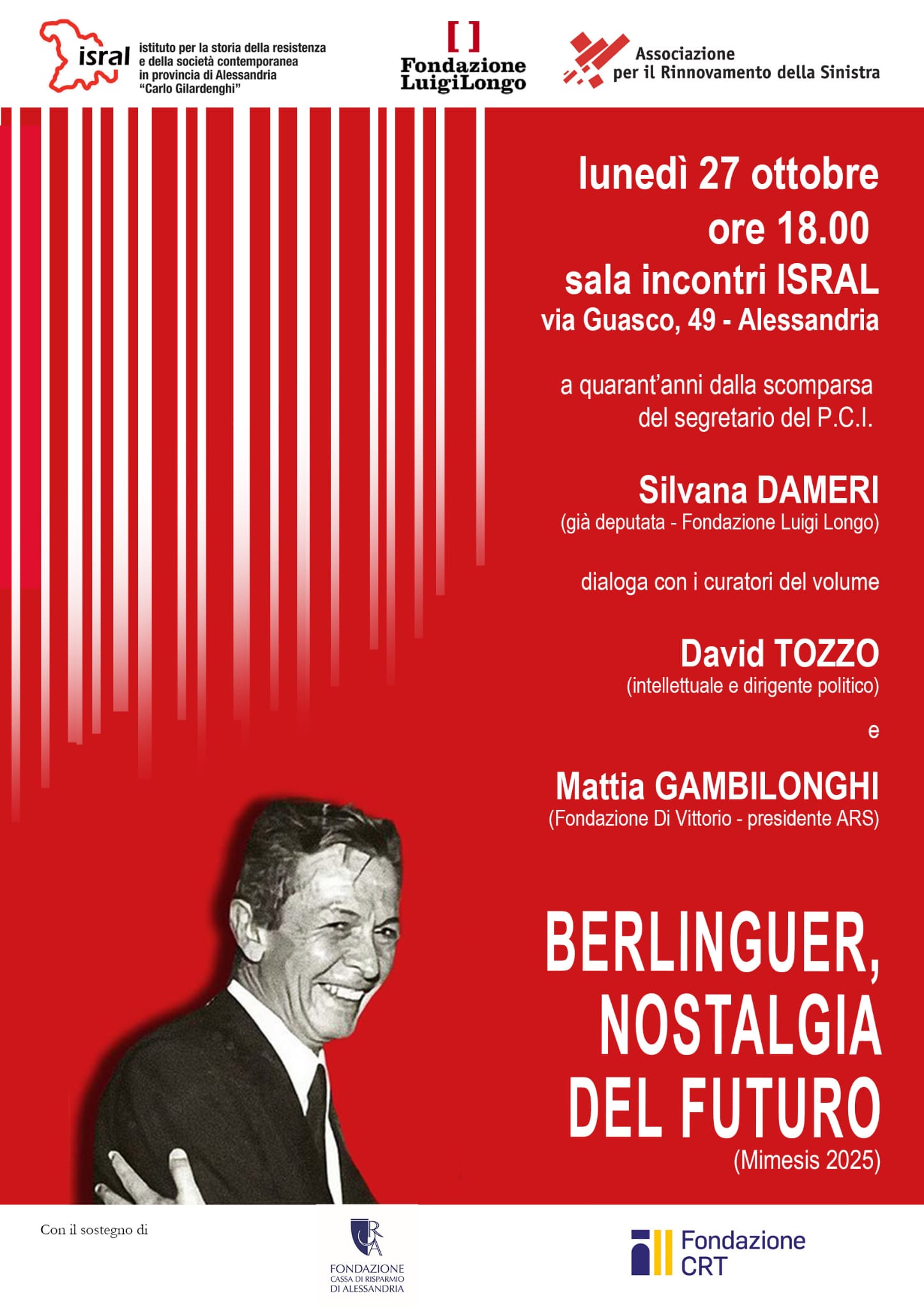 L'Istituto storico della Resistenza di Alessandria, la Fondazione Luigi Longo e l'Associazione per il Rinnovamento della Sinistra, promuovono per il 27 ottobre un dibattito intorno al libro curato da David Tozzo e Mattia Gambilonghi, "Berlinguer: nostalgia del futuro" (Mimesis 2025).
