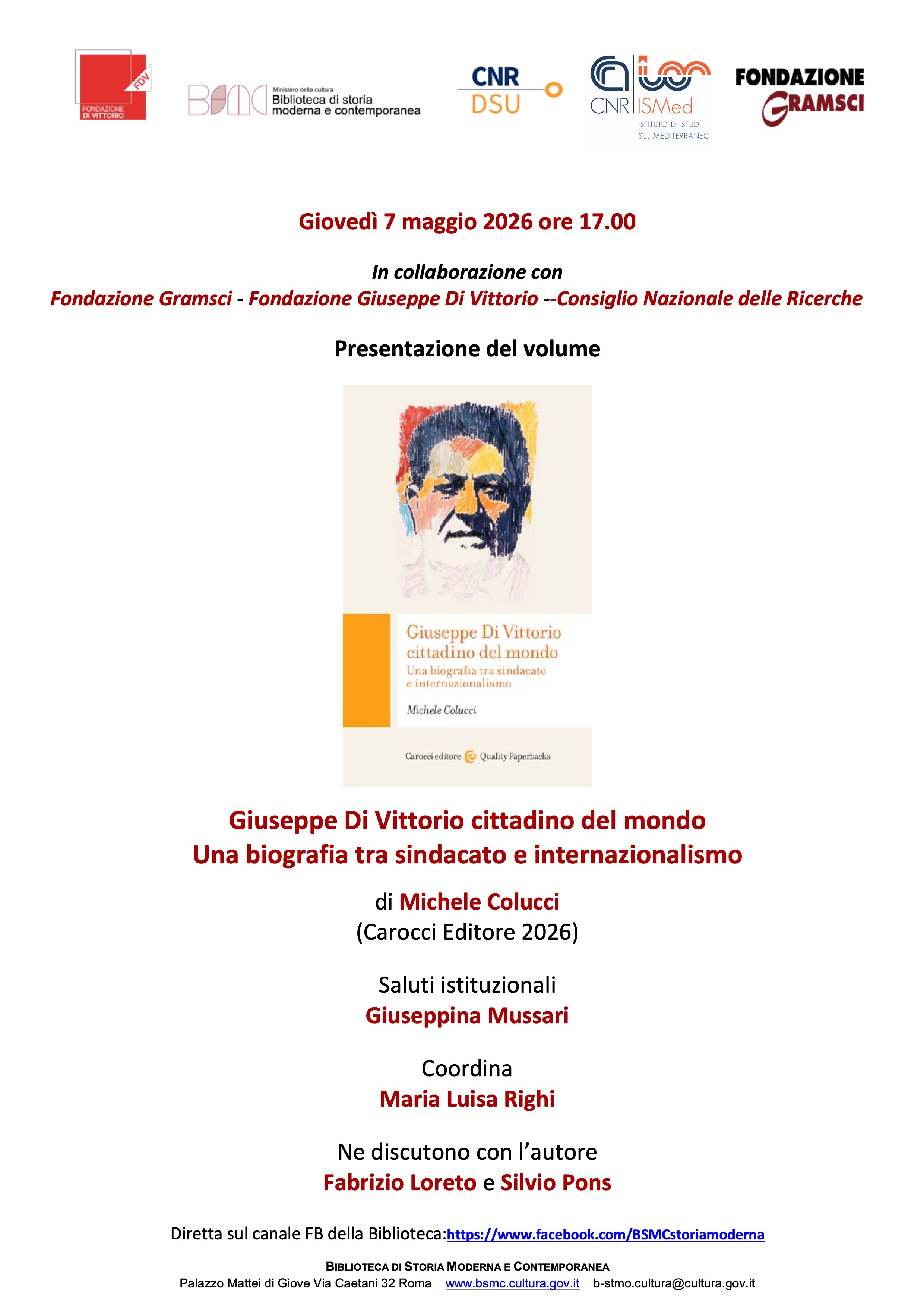 Si svolgerà il giorno giovedì 7 maggio, presso la Biblioteca di Storia Moderna e Contemporanea, a Roma, la presentazione del volume dal titolo "Giuseppe Di Vittorio cittadino del mondo. Una biografia tra sindacato e internazionalismo" edito da Carocci Editore. Discuteranno con l'autore Michele Colucci gli storici Fabrizio Loreto e Silvio Pons, coordina Maria Luisa Righi; saluti istituzionali di Giuseppina Mussari, Direttrice della Biblioteca ospitante.