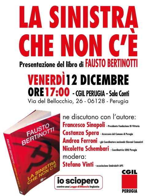 Si svolgerà venerdì 12 dicembre la presentazione del libro "La sinistra che non c'è" di Fausto Bertinotti, edito da Rai Libri.