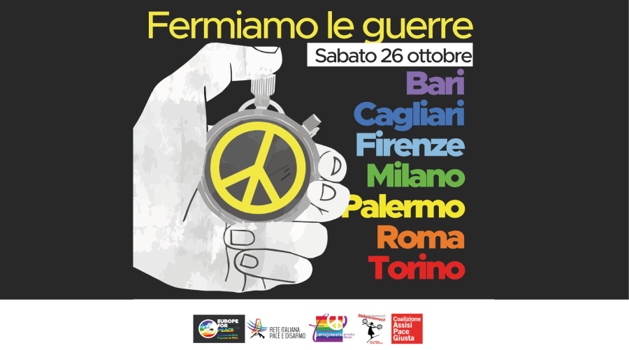 “Fermiamo le guerre, il tempo della Pace è ora” 26 ottobre 2024 giornata di mobilitazione nazionale con manifestazioni a Torino, Milano, Firenze, Roma, Bari, Palermo e Cagliari.