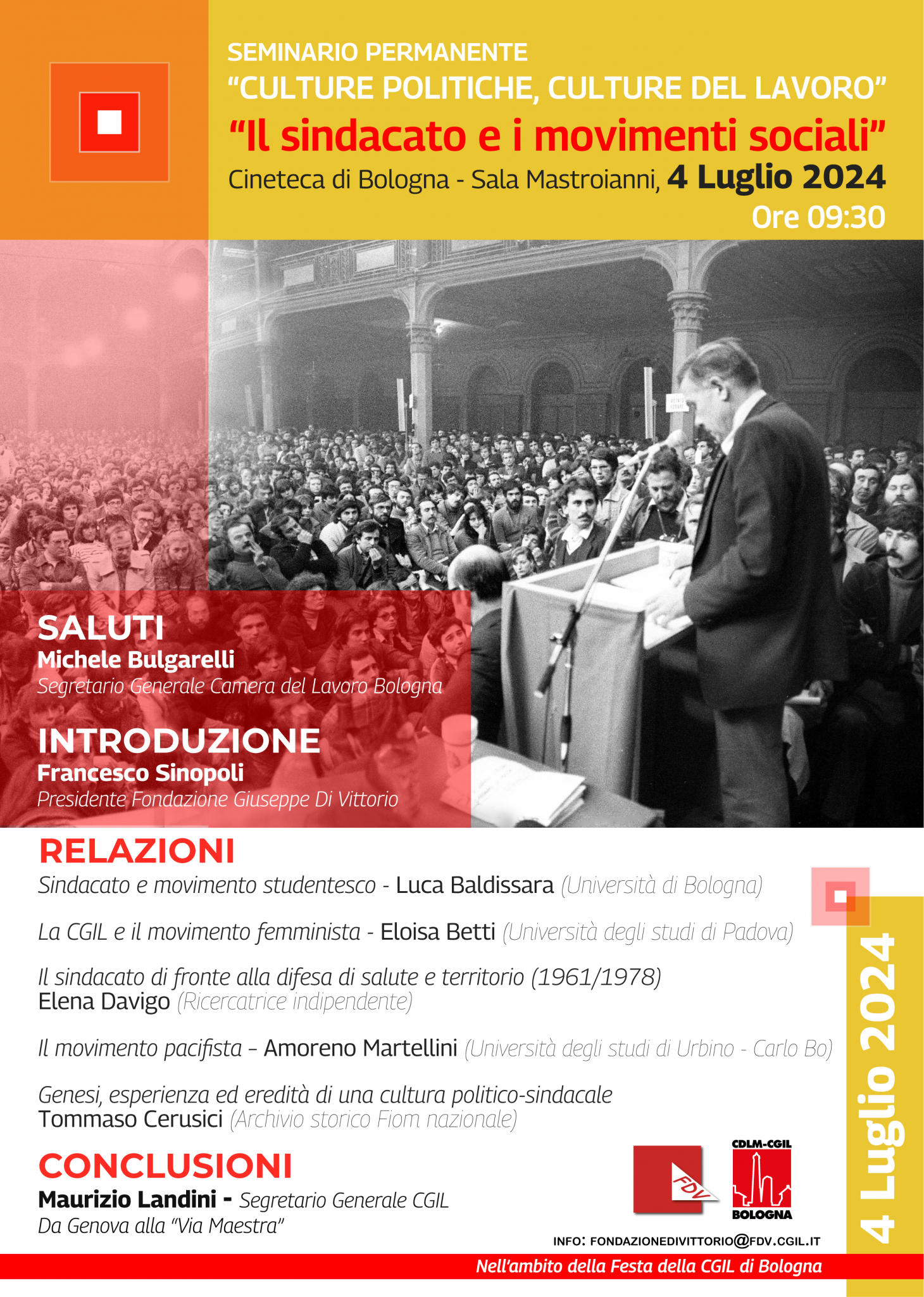 La giornata, organizzata da FDV e CGIL Bologna, vedrà esponenti del mondo accademico, sindacale e della ricerca che interverranno con relazioni sul tema delle grandi lotte sindacali e culturali che hanno contraddistinto il nostro paese fino agli inizi degli anni ’80 del Novecento.
